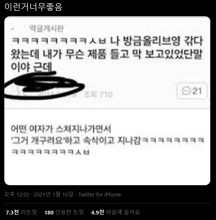 방금올리브영 갔다왔는데 내가 무슨 제품 들고 막 보고있었단말이야 근데 어떤 여자가 스쳐지나가면서 '그거