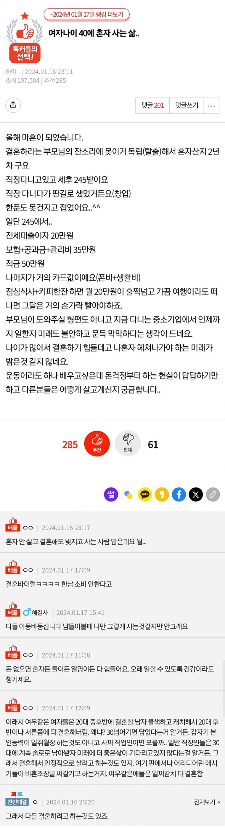 여자 나이 40에 혼자 사는 삶