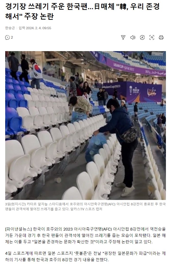 “한국팬들이 경기장 청소” 찬사에…일본 “우리 문화 존경해서”