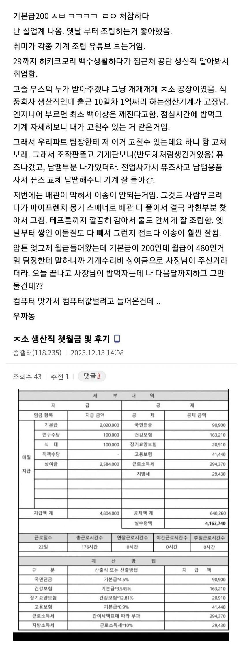 중소 생산직 첫월급 및 후기
