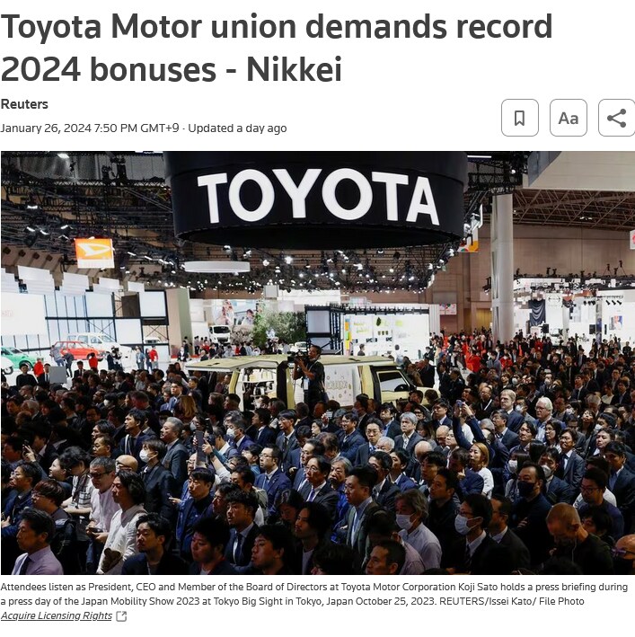 토요타 근황 "노조가 사상 최대의 보너스를 요구 중"